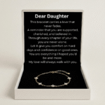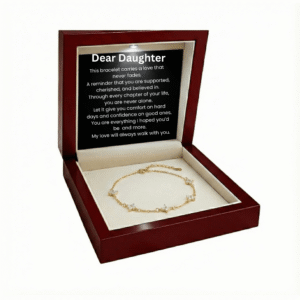 The Golden Whisper Bracelet is a shining reminder of the unbreakable bond between parent and daughter. Every sparkling crystal symbolizes the love, guidance, and courage you’ve watched her grow with a bond that whispers strength in every step of her journey. Elegant and timeless, it’s a gift that says: You’ll always carry my love with you.