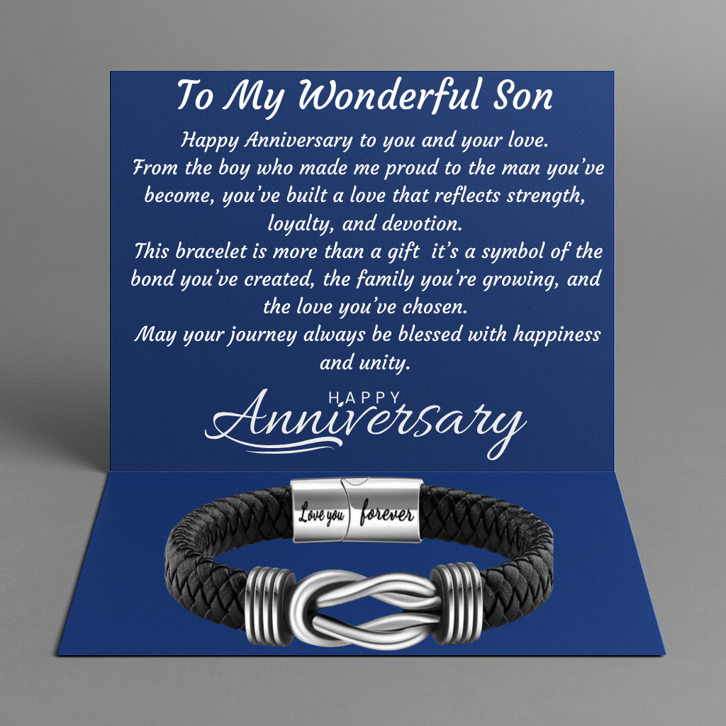 The braided leather band and metal clasp represent strength woven with purpose, reminding him of the foundation built through love and shared experiences. The engraved “Love You Forever” message serves as a lasting reminder of pride, encouragement, and connection.