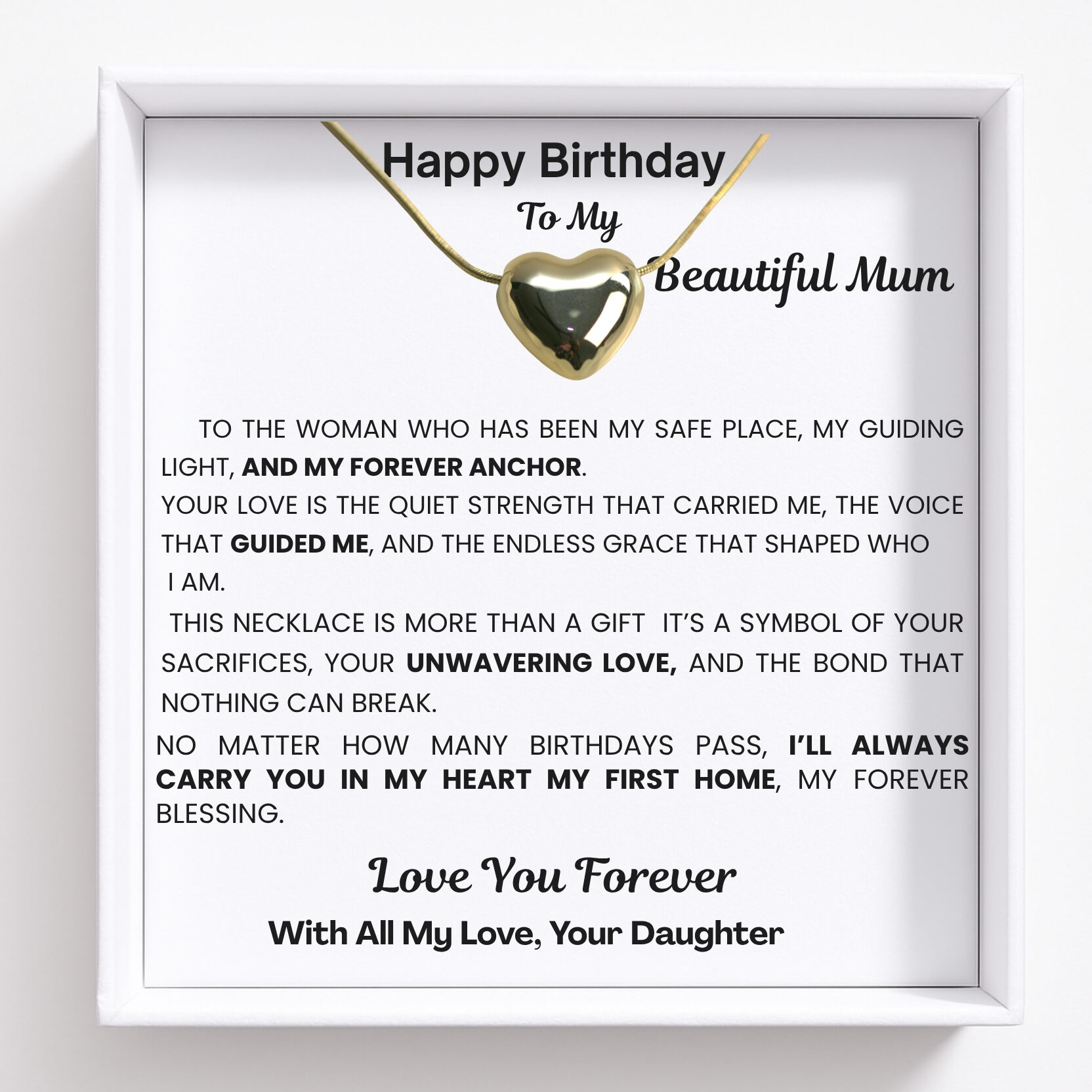 The heart-shaped pendant represents the warmth and strength she has always given you, while its smooth, polished finish reflects her unwavering grace and elegance. The included message card expresses gratitude for her sacrifices, guidance, and unconditional love – the qualities that make her who she is.