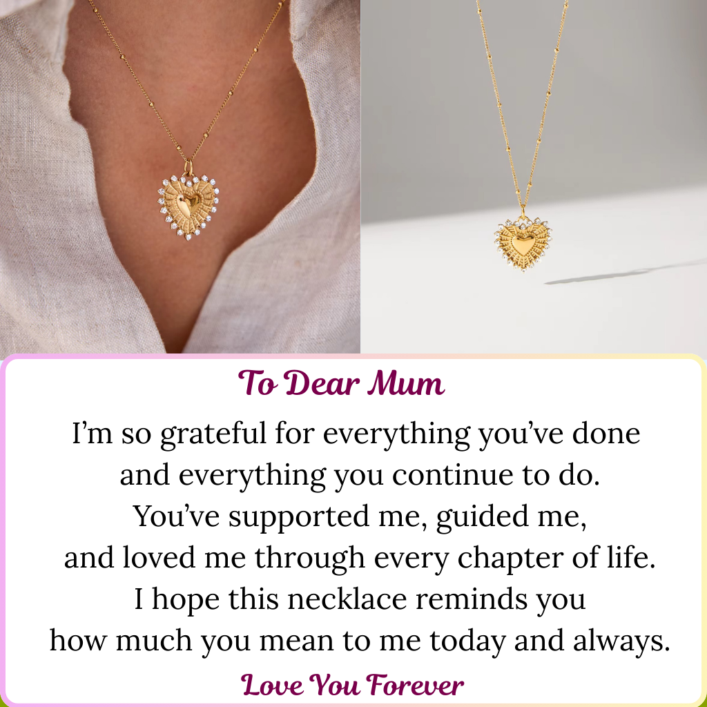 The Heart of My Mum Pendant Necklace features a beautifully ribbed gold heart surrounded by white zircon stones, creating a soft, elegant sparkle that suits every style.