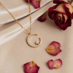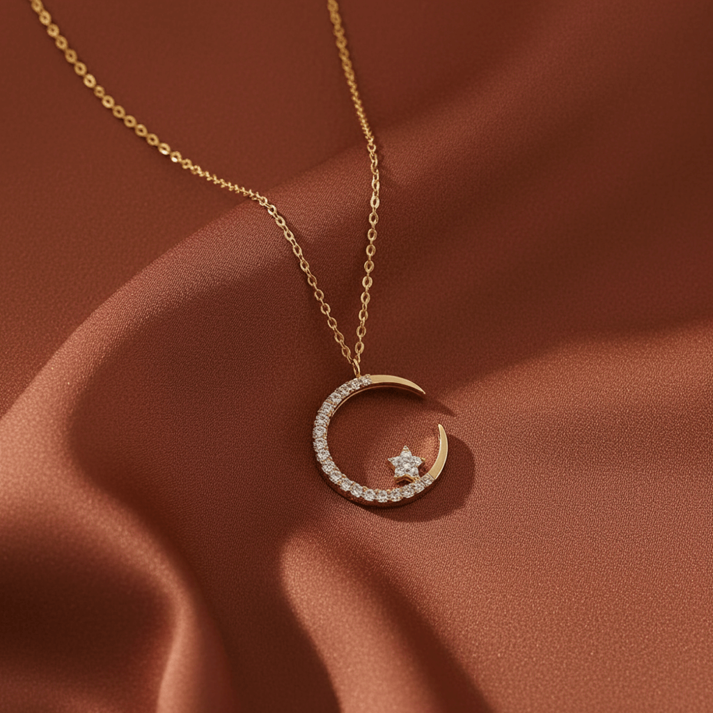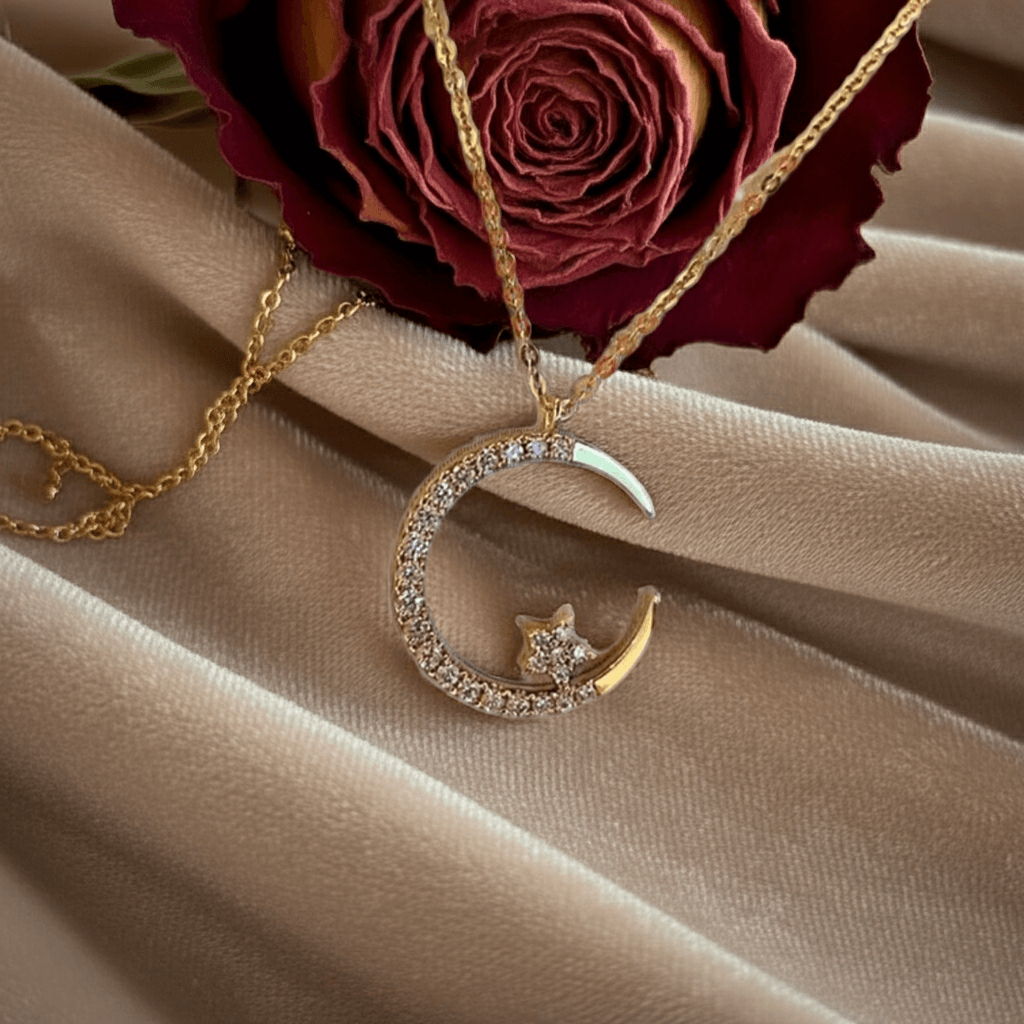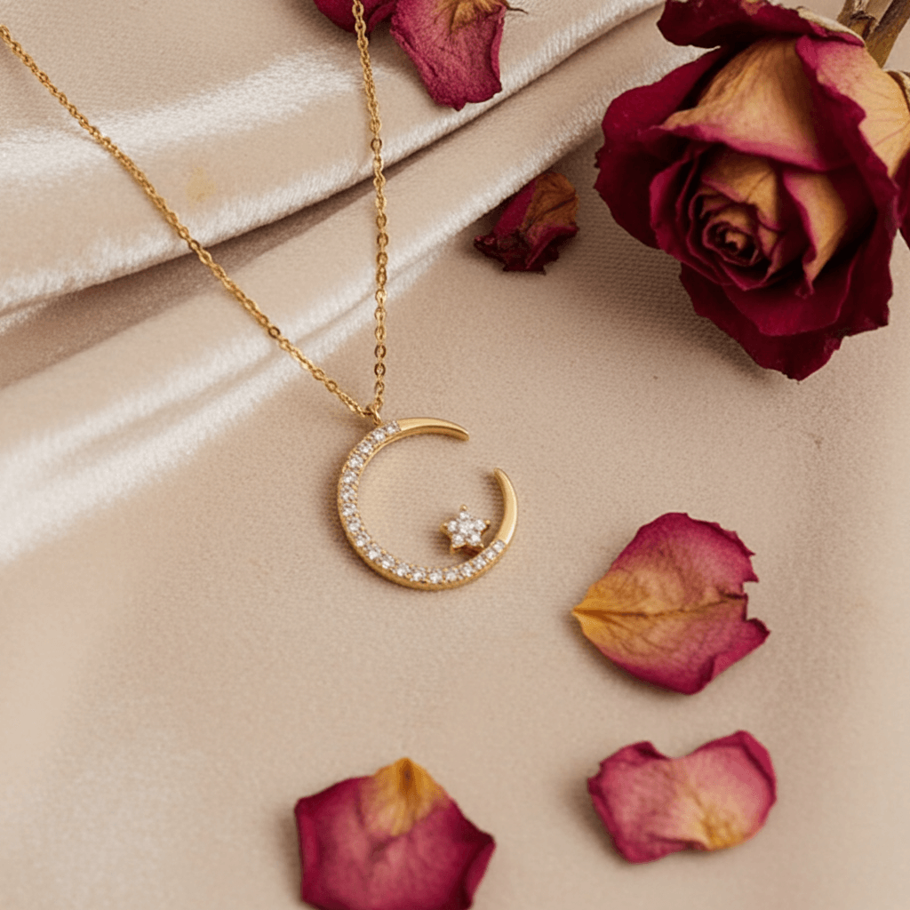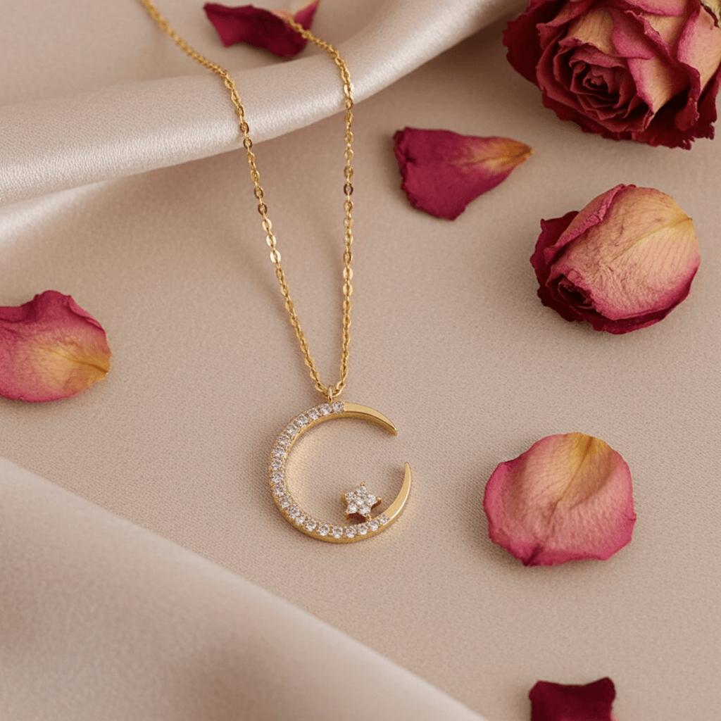 ✔️ Elegant Craftsmanship – Gold-finished crescent moon adorned with shimmering stones and a star centerpiece.