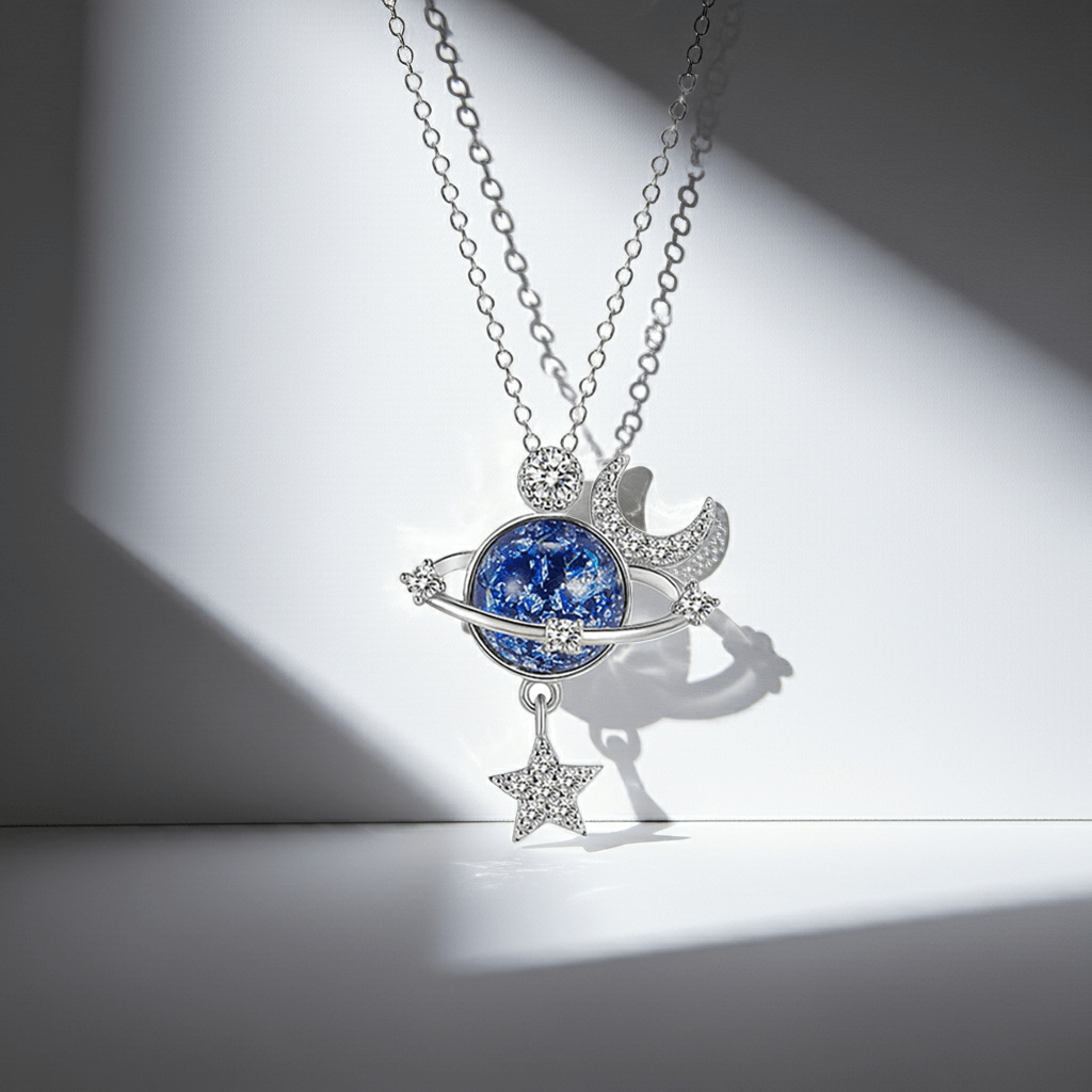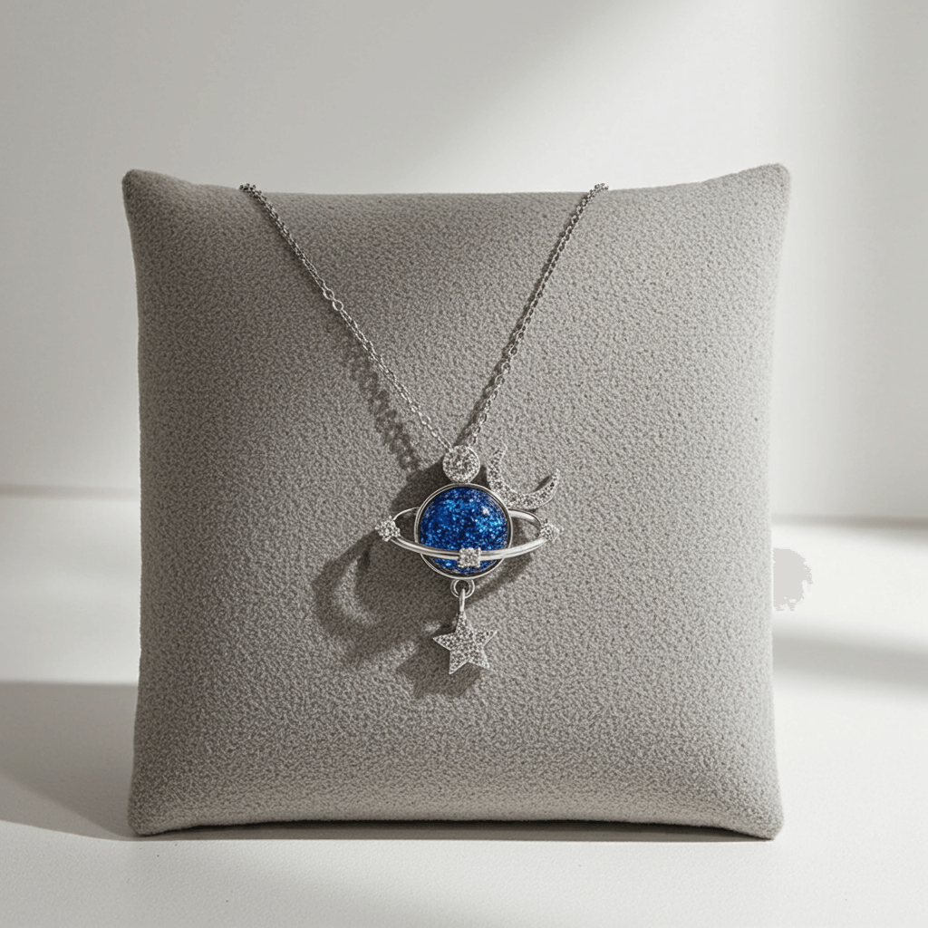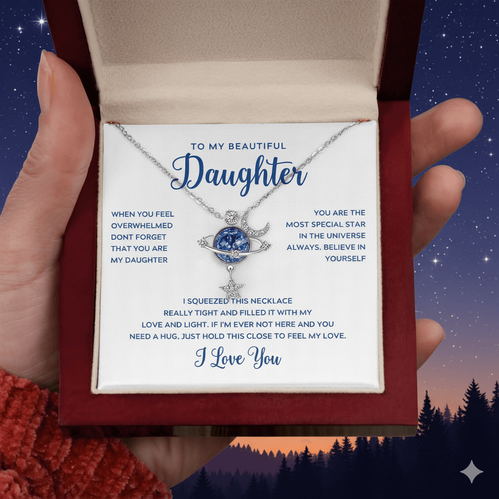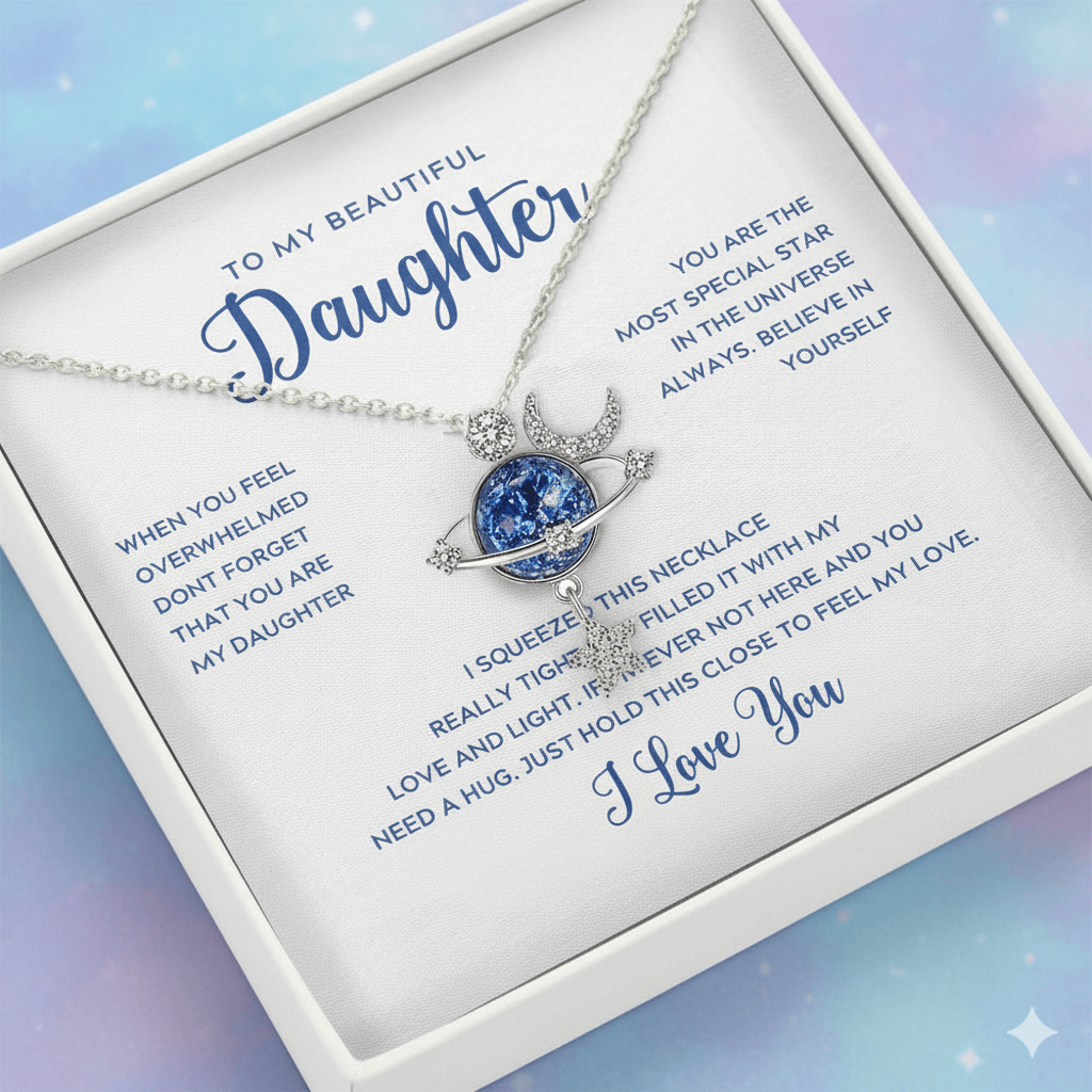 Give your daughter a gift that speaks directly to her heart. This stunning Cosmic Love Necklace is more than just jewelry it’s a message of love, strength, and belief in herself. Featuring a brilliant blue crystal planet, surrounded by shimmering stars and a delicate crescent moon, this piece symbolizes the infinite bond between you and your daughter, making it the perfect choice .