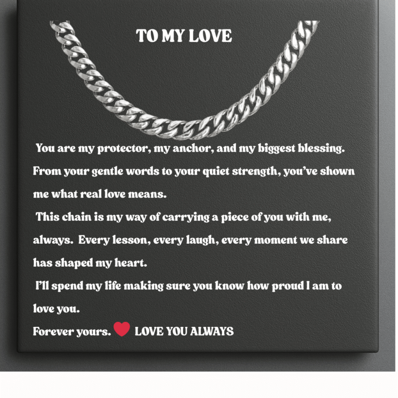 “You are my protector, my anchor, and my biggest blessing. From your gentle words to your quiet strength, you’ve shown me what real love means. This chain is my way of carrying a piece of you with me, always. Every lesson, every laugh, every moment we share has shaped my heart. I’ll spend my life making sure you know how proud I am to love you. Forever yours. Love you always.”