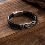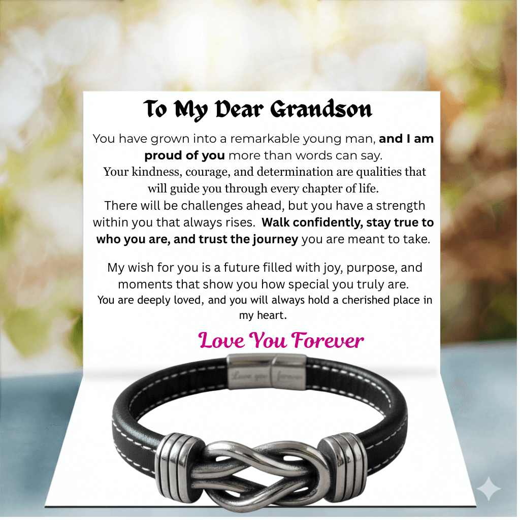 The Bold Steps Infinity Bracelet combines a timeless vintage look with a powerful symbol of connection. The stainless steel infinity knot represents the unbreakable bond between Grandmother or Grandfather and Grandson, while the retro-textured wristband gives the piece a strong, masculine feel.